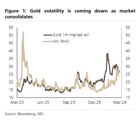 瑞银同时指出,持续高企的价格波动率若长期维持,可能对多元化配置流入构成挑战。但目前来看,黄金波动率已从高点回落,相对于VIX指数的走势趋于正常化。报告认为,当前的整理阶段有助于金价在高位形成坚实支撑,为市场参与者重新入场、在下一轮上涨前积累仓位创造良好起点。