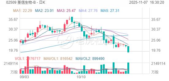 生物医药股重挫,荃信生物-B跌超13%,圣诺医药-B跌超10%,康宁杰瑞制药-B跌超9%,来凯医药-B、绿竹生物-B、基石药业-B跌超7%;