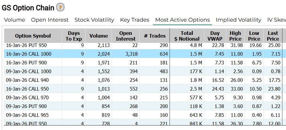 高盛方面,一张1月16日到期的CALL,成交量排在当日第二位,行权价达1000美元。
