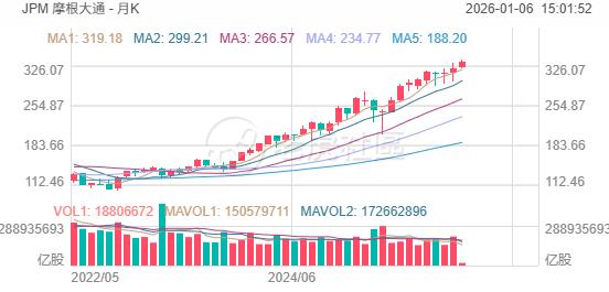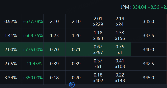 期权方面,我们注意到摩根大通的认购合约集体暴涨,其中一张1月9日到期的CALL,行权价340美元,价格涨幅达775%。其余还有多张合约出现600%以上的涨幅。