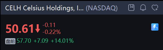 Celsius Holdings, Inc. 涨超14%。公司四季度每股收益为0.26美元,超出分析师普遍预期的0.20美元,同比增长了85.71%。季度销售额为7.22亿美元,超出预期,同比增长了117.23%。