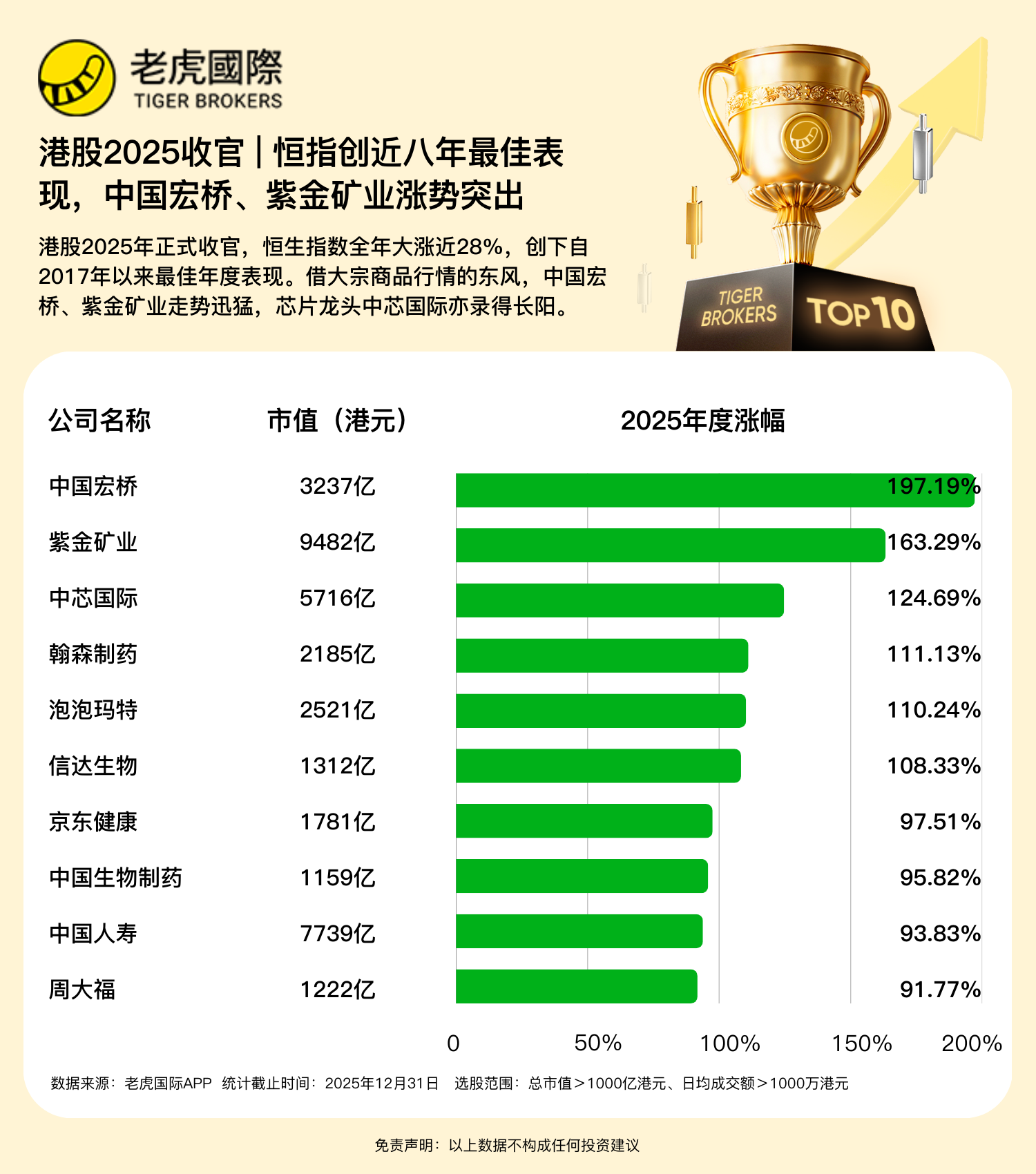 今天,港股2025正式收官,三大指数全年收涨。其中, 恒生指数 大涨近28%,创下自2017年以来的最佳年度表现。权重个股方面,借大宗商品行情的东风, 中国宏桥 、 紫金矿业 走势迅猛,芯片龙头 中芯国际 亦录得长阳。此外, 翰森制药 、 泡泡玛特 、 信达生物 等均有强劲表现。