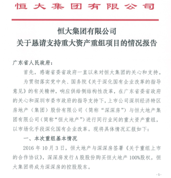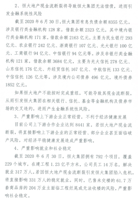 网传恒大地产若不能按时完成重组,或引发系统性风险,中国恒大跌5.58%,报15.22港元;恒大汽车跌8.63%,报19.28港元。今日一份题为《恒大集团有限公司关于恳请支持重大资产重组项目的情况报告》的文件截图在网络上传播,根据这份文件,恒大集团对广东省人民政府“诉苦”,称若恒大地产与深深房不能按时完成重组,可能引发一系列的系统性风险,包括恒大地产现金流断裂导致恒大集团无法偿债,进而引发金融系统性风险;严重影响上下游企业经营;严重影响就业和社会稳定;引发大规模群体性维权,严重影响资本市场健康稳定等。恒大集团对这份文件暂未给予回应。