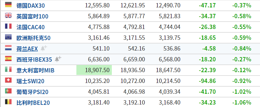 欧洲主要指数集体下跌,欧洲斯托克50指数跌0.59%,英国富时100指数跌0.58%,德国DAX30指数跌0.37%。