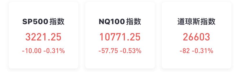 美国三大股指期货盘前下跌,截至发稿,道指期货跌0.31%;标普500指数期货跌0.31%;纳斯达克100指数期货跌0.53%。