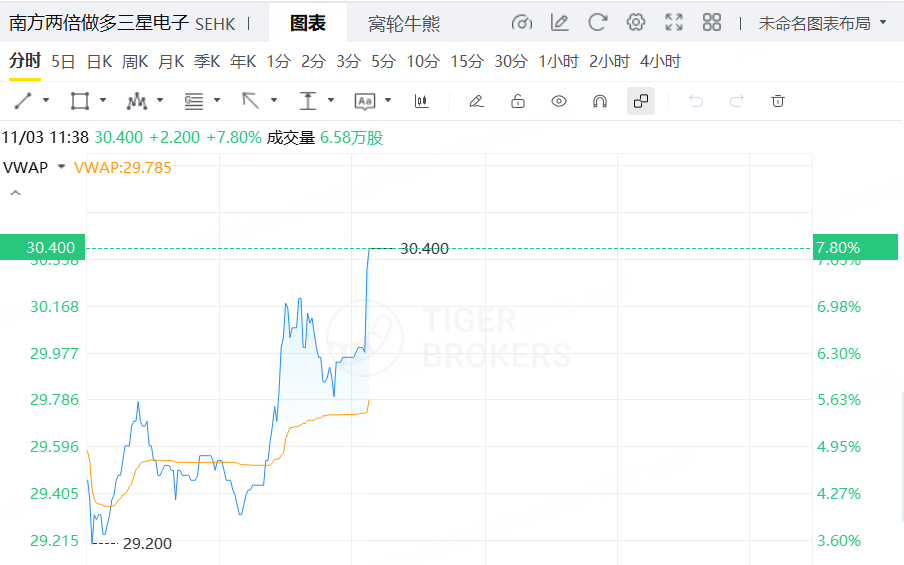 11月3日,南方两倍做多海力士大涨19%, 南方两倍做多三星电子涨近8%。