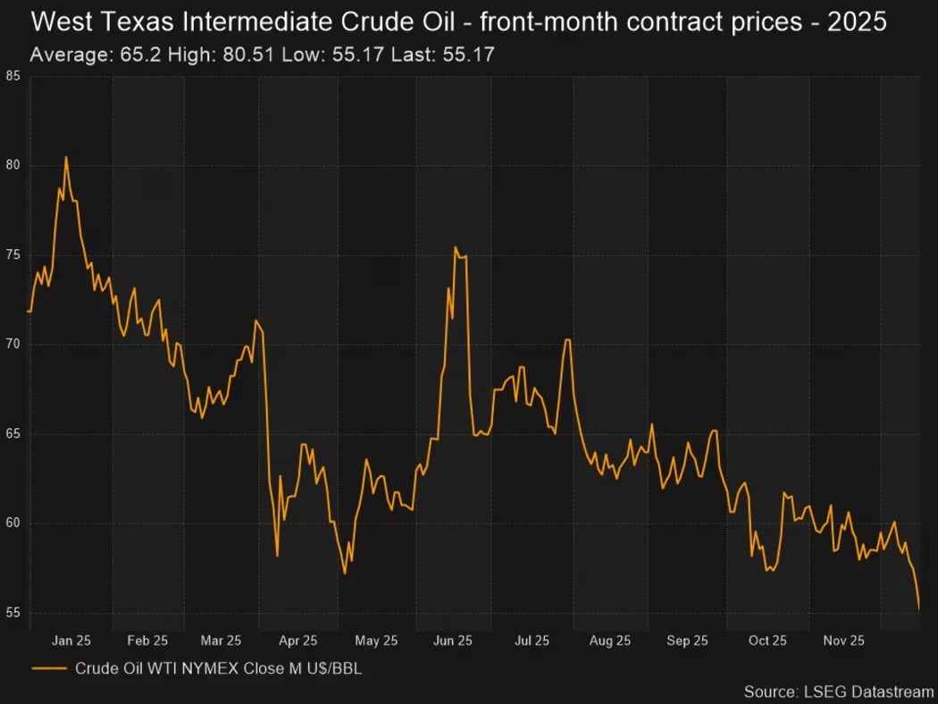 表格最右侧一列显示的是今年的总回报率(假设股息再投资)。这些股票中的大多数在 2025 年都遭遇了重挫。其中有四家(SM Energy〔SM〕、Northern Oil & Gas〔NOG〕、EOG Resources〔EOG〕和 Permian Resources〔PR〕)是石油和/或天然气生产商。Kinetik Holdings(KNTK)则为石油和天然气生产商提供运输及其他相关服务。