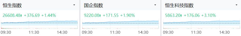 港股市场在AI应用大爆发带动下,市场做多情绪高涨。截止收盘,恒生指数涨1.44%,恒生科技指数涨3.10%,国企指数涨1.90%。