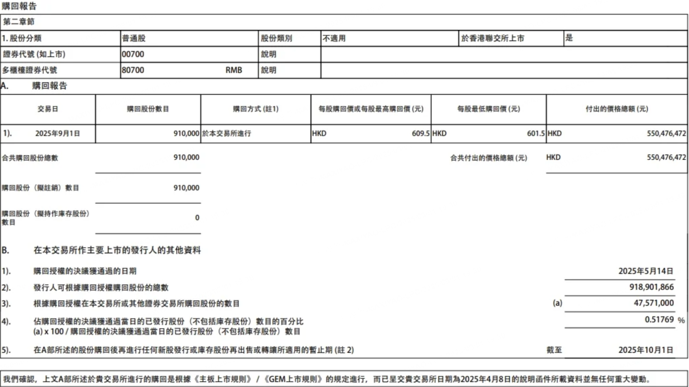 腾讯控股发公告称:将于9月1日回购91万股股票,每股回购价格为601.5港元-609.5港元,共耗资约5.5亿港元.