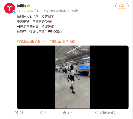 4月3日上午消息,特斯拉宣布旗下Optimus人形机器人又有更新,行走步态更稳,摆臂更轻盈,AI技术与车同源,持续进化。