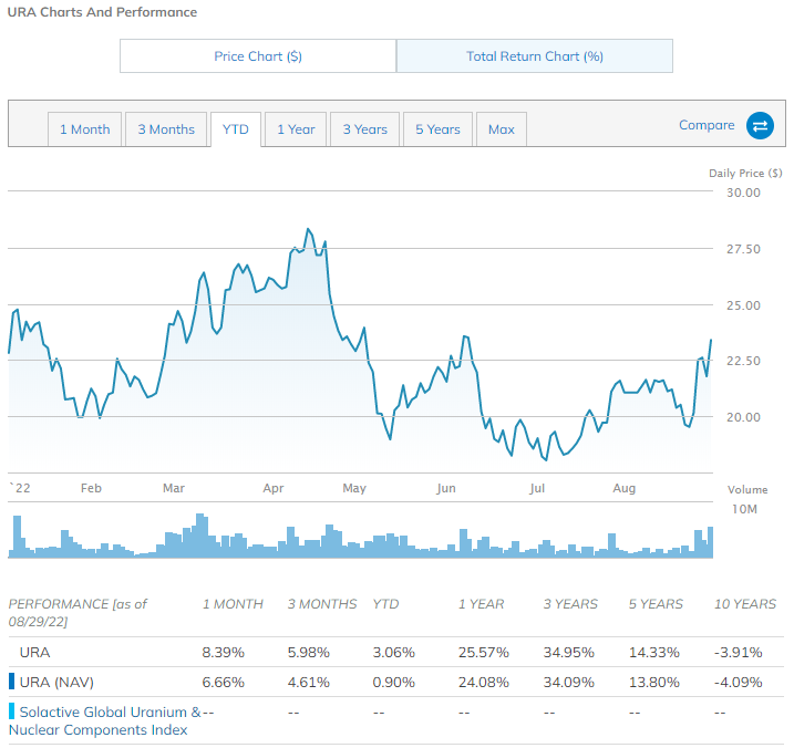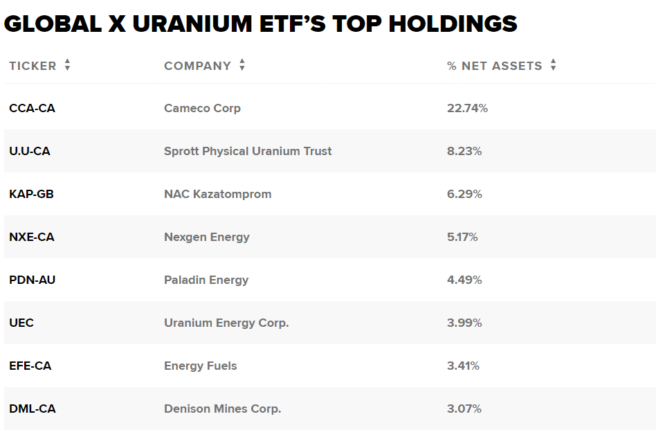 URA 跟踪涉及铀矿开采和核部件生产的公司的市值加权指数。