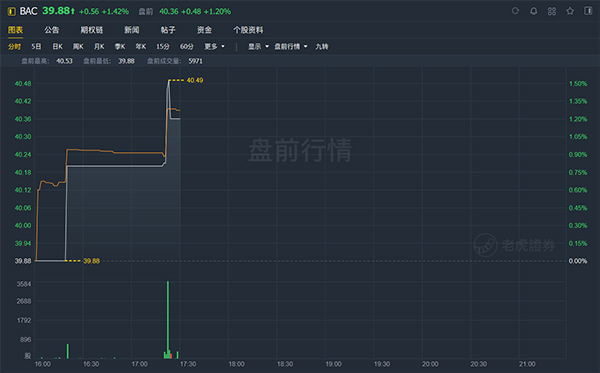 截至发稿,美国银行盘前涨1.2%。