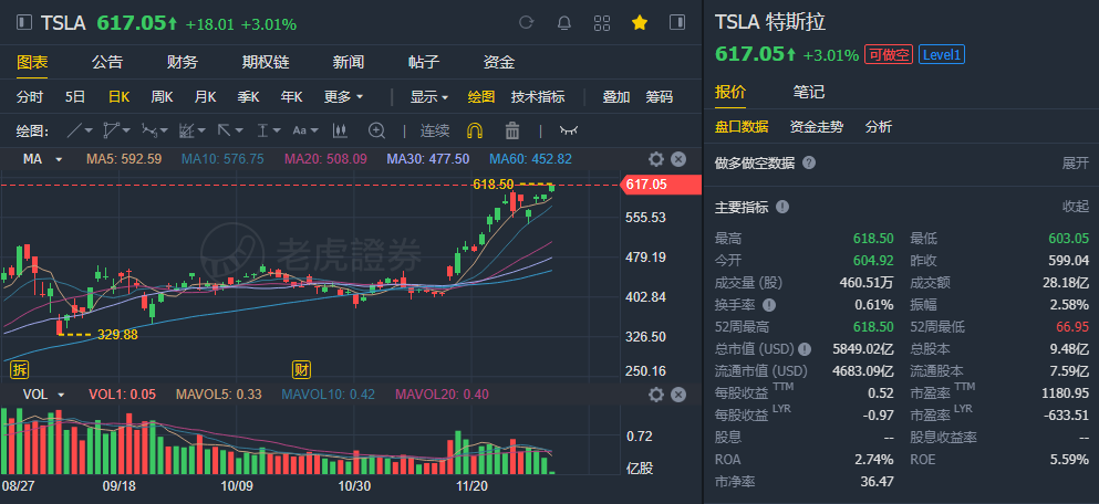 特斯拉涨超2%,报614.44美元,股价创新高。