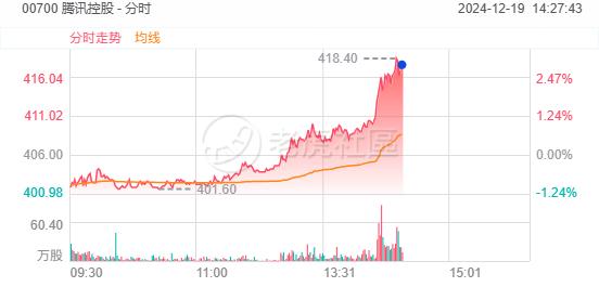 本周四(12月19日)午后, 腾讯控股 短线拉升超3%,截至发稿报418港元,涨幅2.96%: