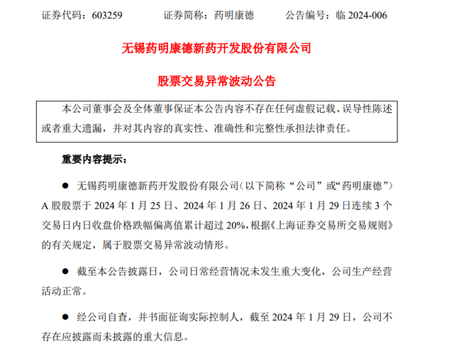 周一晚,药明康德公告称,截至本公告披露日,公司日常经营情况未发生重大变化,公司生产经营活动正常。经公司自查,并书面征询实际控制人,截至2024年1月29日,公司不存在应披露而未披露的重大信息。