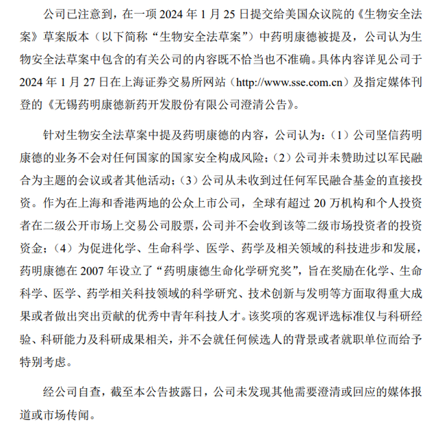 药明康德在公告中还表示,公司已注意到,在一项2024年1月25日提交给美国众议院的《生物安全法案》草案版本(简称“生物安全法草案”)中药明康德被提及,公司认为生物安全法草案中包含的有关公司的内容既不恰当也不准确。