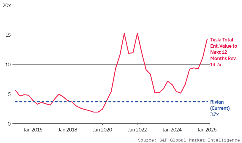 从估值对比来看(下图),Rivian 当前不到 4 倍的市销率,与特斯拉超过 14 倍的估值水平形成鲜明反差,使其成为更具吸引力的替代选择。
