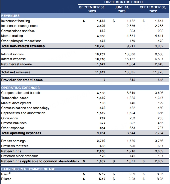 高盛第三季度咨询收入8.31亿美元,市场预估7.307亿美元;贷款1780亿美元,市场预估1796.8亿美元;股票销售和交易业务营收29.6亿美元,市场预估26.8亿美元;投行业务营收15.6亿美元,市场预估15.4亿美元。