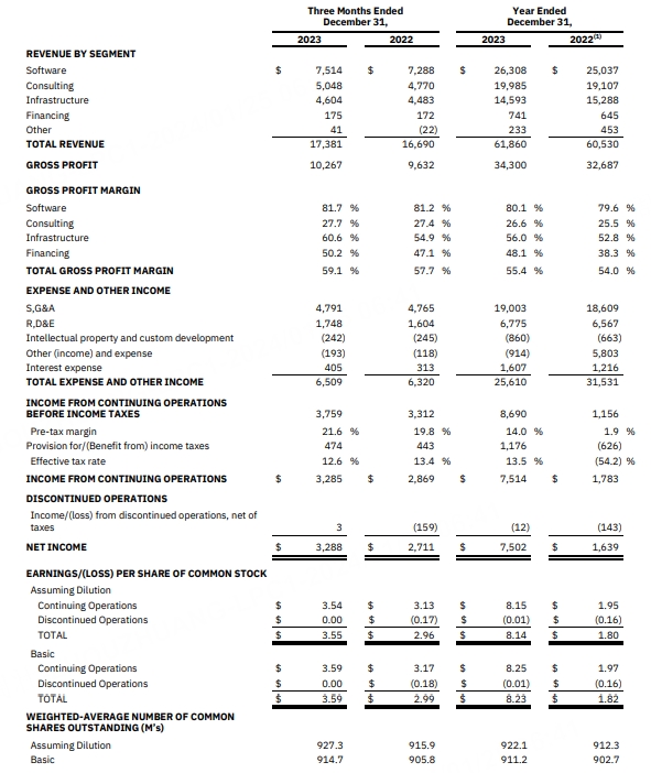 1月25日,IBM发布2023年第四季度业绩。财报显示,第四季度营收173.81亿美元,市场预期172.9亿美元,去年同期166.9亿美元;净利润32.88亿美元,市场预期28亿美元,去年同期27.1亿美元;每股收益3.55美元,市场预期3.28美元,去年同期2.96美元。