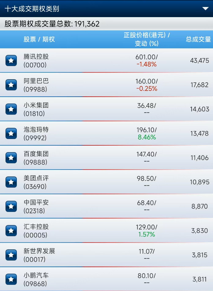 港股股票期权上午成交191362张合约。腾讯控股期权成交排名榜首,总量43475张合约。阿里、小米、泡泡玛特、百度、美团等紧随其后。