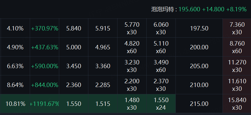 期权方面,泡泡玛特的认购合约价格集体大涨,其中一张1月29日到期的CALL,行权价215港元,价格狂飙1191%。