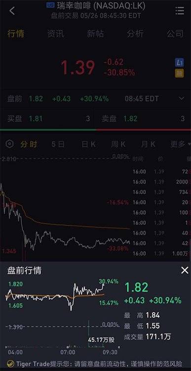 瑞幸咖啡盘前一路冲高,暴涨30%。