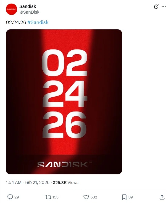 存储概览龙头 闪迪 (SanDisk)今日在社交媒体发布一张极简预告海报,以 “02 24 26” 字样,暗示将于2026 年 2 月 24 日推出全新产品或技术。