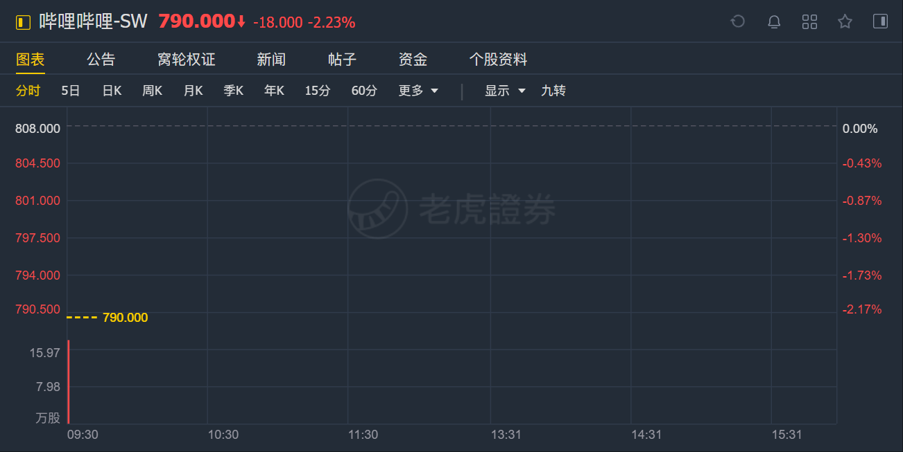 哔哩哔哩-SW港股上市首日破发,开跌超2%,发行价808港元/股。