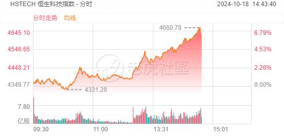 10月18日,恒生科技指数涨幅扩大至7%,恒生指数涨超4%。