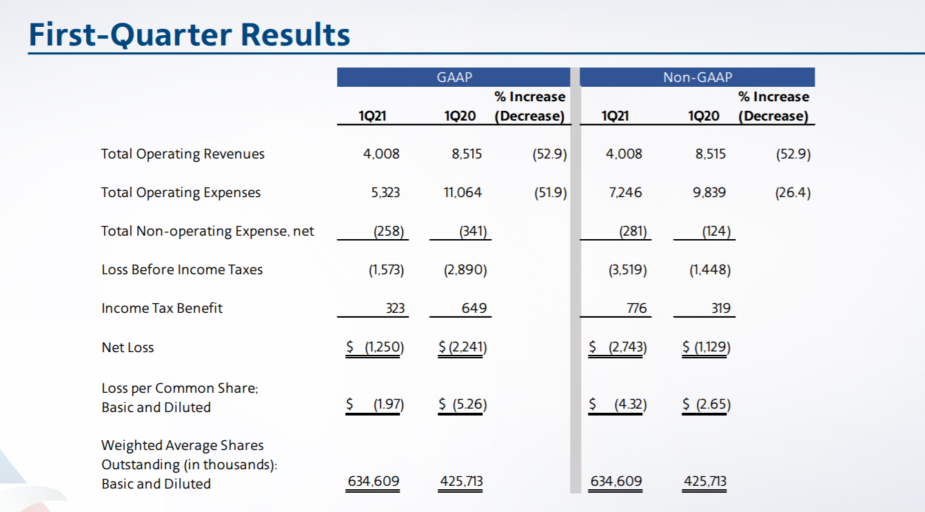 4月22日,美国航空集团盘前发布财报,财报显示:2021年Q1营收40.08亿美元,市场预期40.5亿美元,去年同期85.15亿美元。