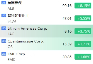 锂电池股盘初多数上涨,美国雅保涨超8%,智利矿业化工涨近5%,Lithium Americas涨超3%