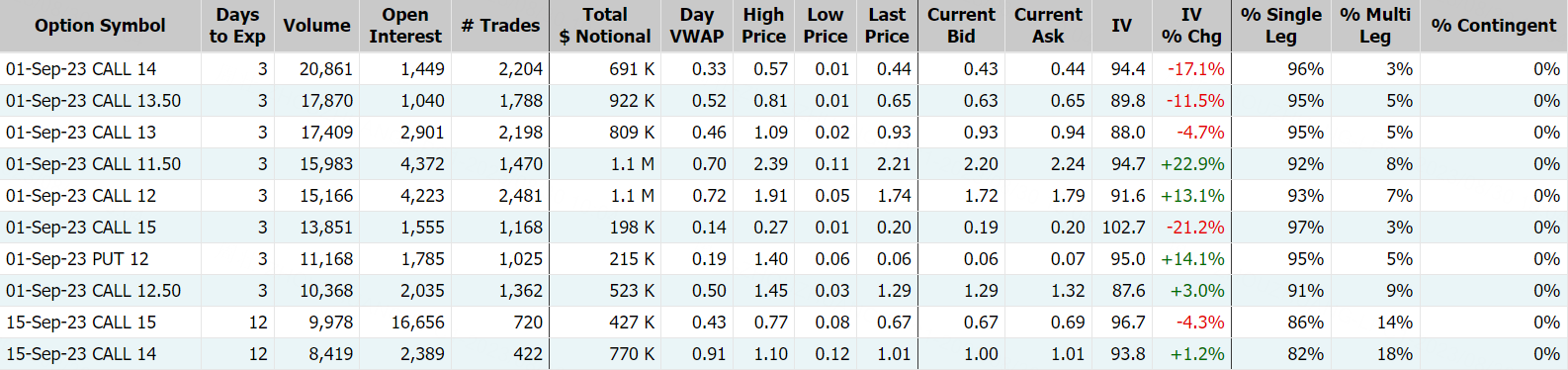Marathon Digital隔夜期权成交38.33万张,看涨期权占比近70%,其中2023年9月1日到期的14美元行使价的看涨期权成交活跃。 $MARA 20230901 14.0 CALL$