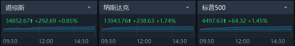 美东时间周二,三大指数连续第三个交易日集体上涨,标普500指数和纳指均涨超1%。截至收盘,道琼斯指数涨0.85%,报34852.67点;标普500指数涨1.45%,报4497.63点;纳斯达克指数涨1.74%,报13943.76点。