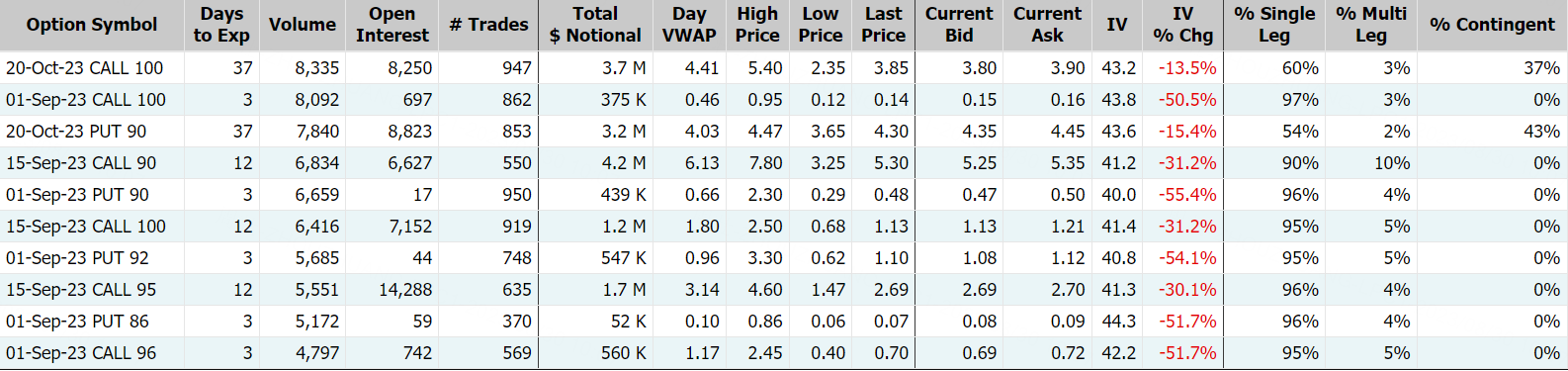 苹果隔夜期权成交114.4万张,环比前一交易日激增逾70%,看涨期权成交活跃,其中2023年9月1日到期的185美元行使价的看涨期权成交居首,达10.12万张,未平仓量2.96万张;另外,同日到期、行权价为182.5/190美元的Call成交与未平仓量均较高。