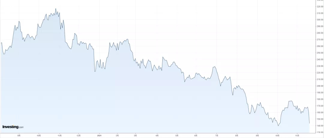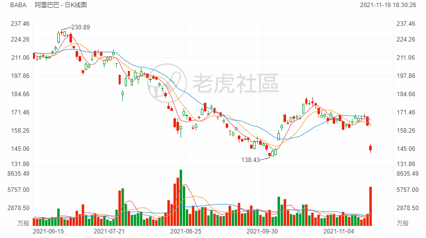 周四阿里巴巴跳空低开,并且放量大幅下跌11.13%,至143.6美元,离10月初的低点138.43美元仅一步之遥。相信短期内大概率将跌破138.43的低点,并且继续向2018年12月28日的低点129.77迈进。