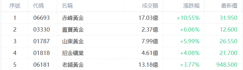 黄金股走高,赤峰黄金涨10.55%,灵宝黄金升逾6%。