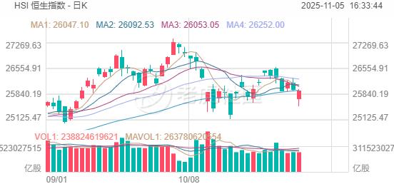 11月5日,午后市场明显回暖,恒生指数、国企指数一度转涨,最终分别收跌0.07%及0.11%,恒指在26000点附近反复震荡,恒生科技指数跌0.56%相对最弱,三大指数均呈现低开高走行情。