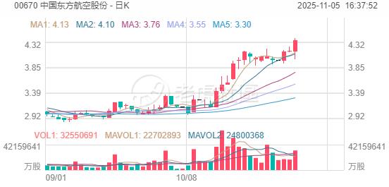 航空股普遍走高,中国东方航空股份涨超4%,中国国航涨超3%,中国南方航空股份涨超2%;