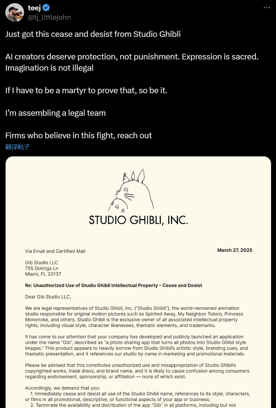自从奥特曼换了头像带起节奏,很多人在用 GPT-4o 生成吉卜力工作室画风的图像,有的人做出了表情包开始卖,也有人顺着这股风潮开始推出滤镜 App,结果有网友开始恶搞,假称吉卜力终于忍无可忍了,发来了律师函: