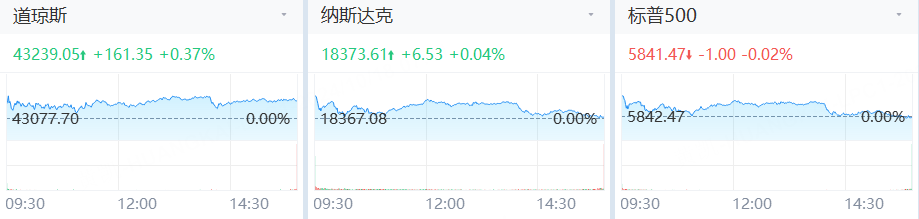 美东时间周四,美股三大指数收盘涨跌不一,道指续创历史新高。截至收盘,道指涨161.35点,涨幅为0.37%,报43239.05点;纳指涨6.53点,涨幅为0.04%,报18373.61点;标普500指数跌1.00点,跌幅为0.02%,报5841.47点。