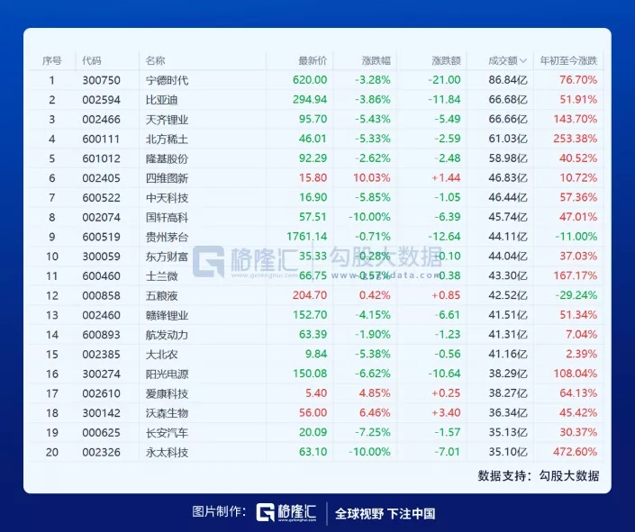 值得注意的是,成交额排名靠前的个股下跌尤为明显,多为年初至今涨幅较大的热门赛道股,上涨较好的多为热门题材概念股。