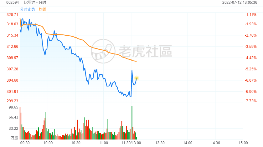 比亚迪A股午后小幅拉升,跌幅收窄至不足6%,此前一度跌超7%。