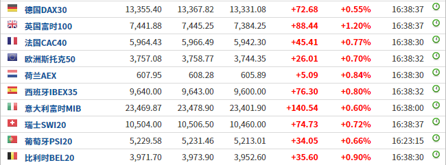 周一欧股开盘普遍上涨,截至发稿,德国DAX指数涨0.55%,英国富时100指数涨1.20%,法国CAC40指数涨0.77%,欧洲斯托克50指数涨0.70%。