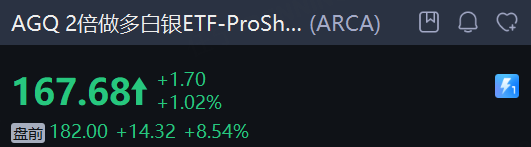现货白银、黄金日内齐创新高,贵金属概念股盘前普涨。科尔黛伦矿业 涨近5%,First Majestic Silver涨超4%, 泛美白银 涨3.85%, 赫克拉矿业 涨3.58%, 2倍做多白银ETF-ProShares 大涨近9%,2倍做多黄金ETF涨近2%。