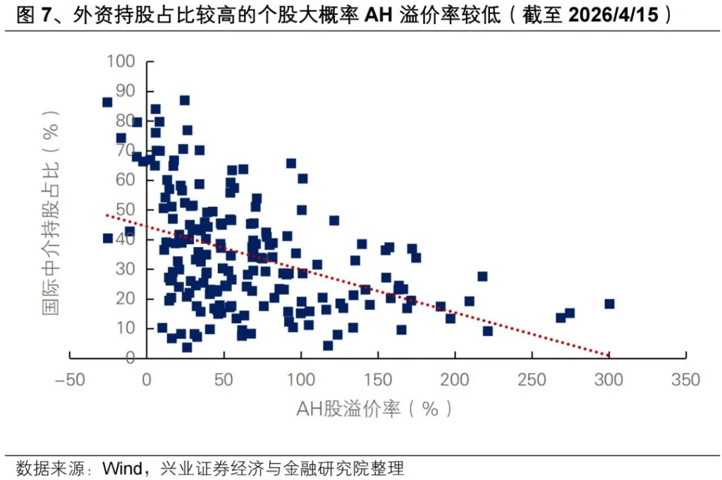 外资是宁德时代AH溢价率变化的“幕后推手”。自宁德时代于港股二次上市以来,其AH溢价率随国际中介占比的提升而不断走低。这背后的原因在于外资是决定AH溢价率高低的核心资金力量。相比于A股市场,港股市场外资定价权更强,其对某不同资产的偏好导致AH溢价率的显著分化,例如外资的青睐往往对应AH溢价率更低。截至4月15日,AH两地同时上市企业中,外资持股占比和AH溢价率呈明显的负相关关系。此外,随着宁德时代H股被纳入MSCI指数体系,两地市场不同的纳入因子及对应的权重分化,导致海外被动资金对AH股的净流入规模“天差地别”。