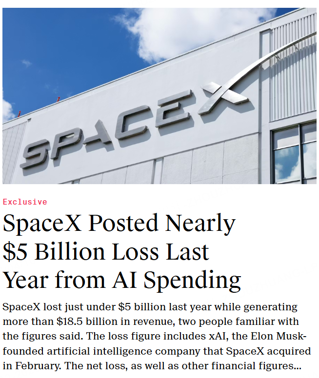 The Information 消息,两名知情人士透露,SpaceX去年亏损近50亿美元,营收则超过185亿美元。