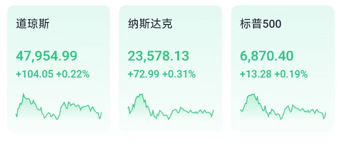 12月5日周五,美股整体窄幅震荡。截至收盘,道指涨104.05点,涨幅为0.22%,报47954.99点;纳指涨72.99点,涨幅为0.31%,报23578.13点;标普500指数涨13.28点,涨幅为0.19%,报6870.40点。本周美股三大指数均录得涨幅。