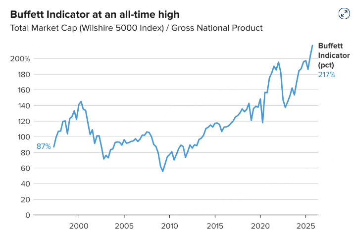 如今,这一指标高达217%,远超互联网泡沫时期的峰值,也超过了2021年疫情时期股市狂热时达到的190%。