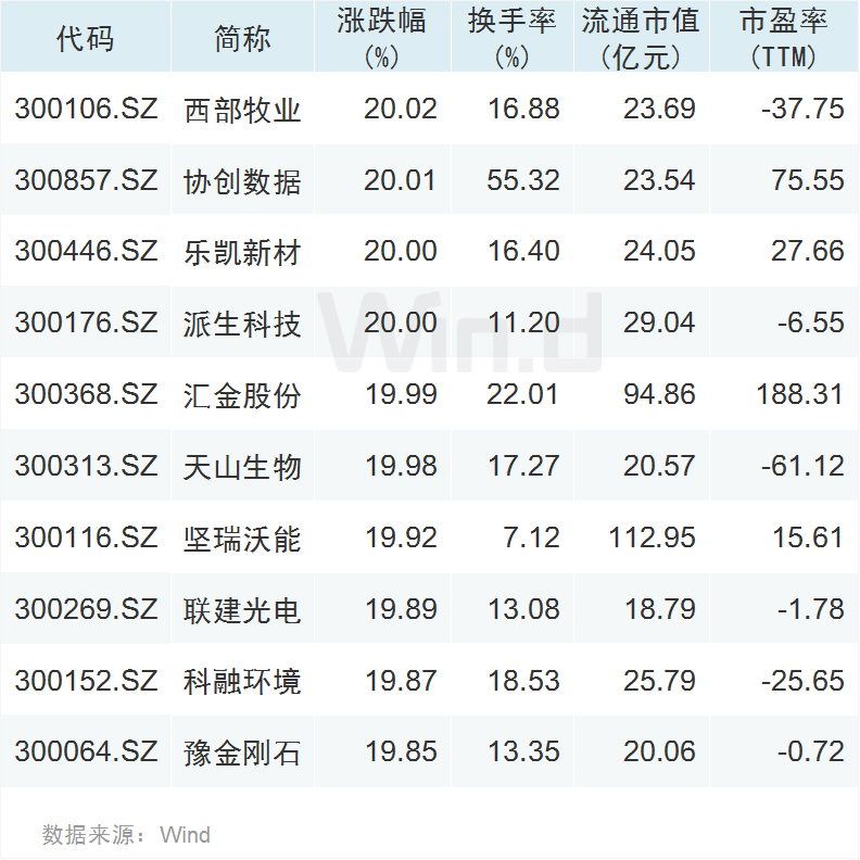 继前一日4家公司涨停后,8月25日,有西部牧业、协创数据、乐凯新材、派生科技、汇金股份、天山生物、坚瑞沃能、联建光电、科融环境、豫金刚石等10家创业板公司20%涨停。其中,天山生物、坚瑞沃能连续两天涨停,累计涨幅超过40%,同时涨幅超过10%的公司也扩大至29家。