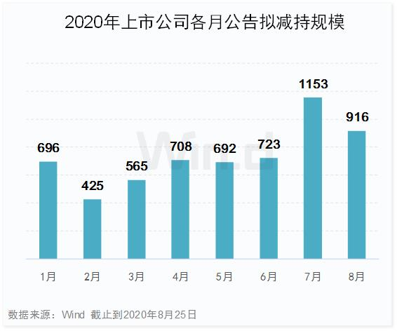 随着中报进入密集披露期,A股减持计划也持续上升。Wind数据显示,从8月1日至8月25日间,两市共有320家A股上市公司披露了新的减持计划,涉及613个减持主体,以8月25日最新收盘价计算,上述320家上市公司合计新披露约916亿元减持计划,加上7月份,下半年A股新增减持计划超两千亿元。